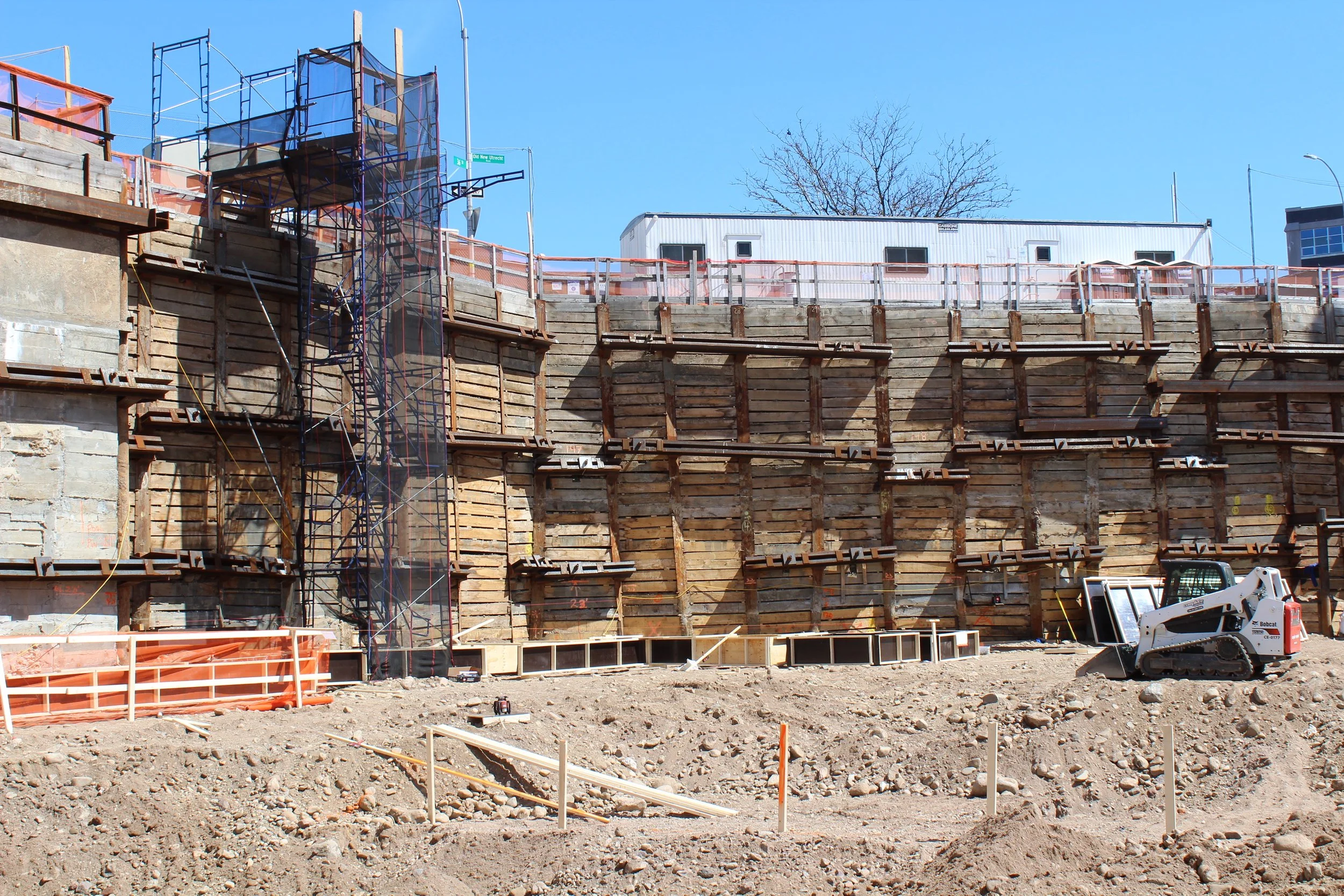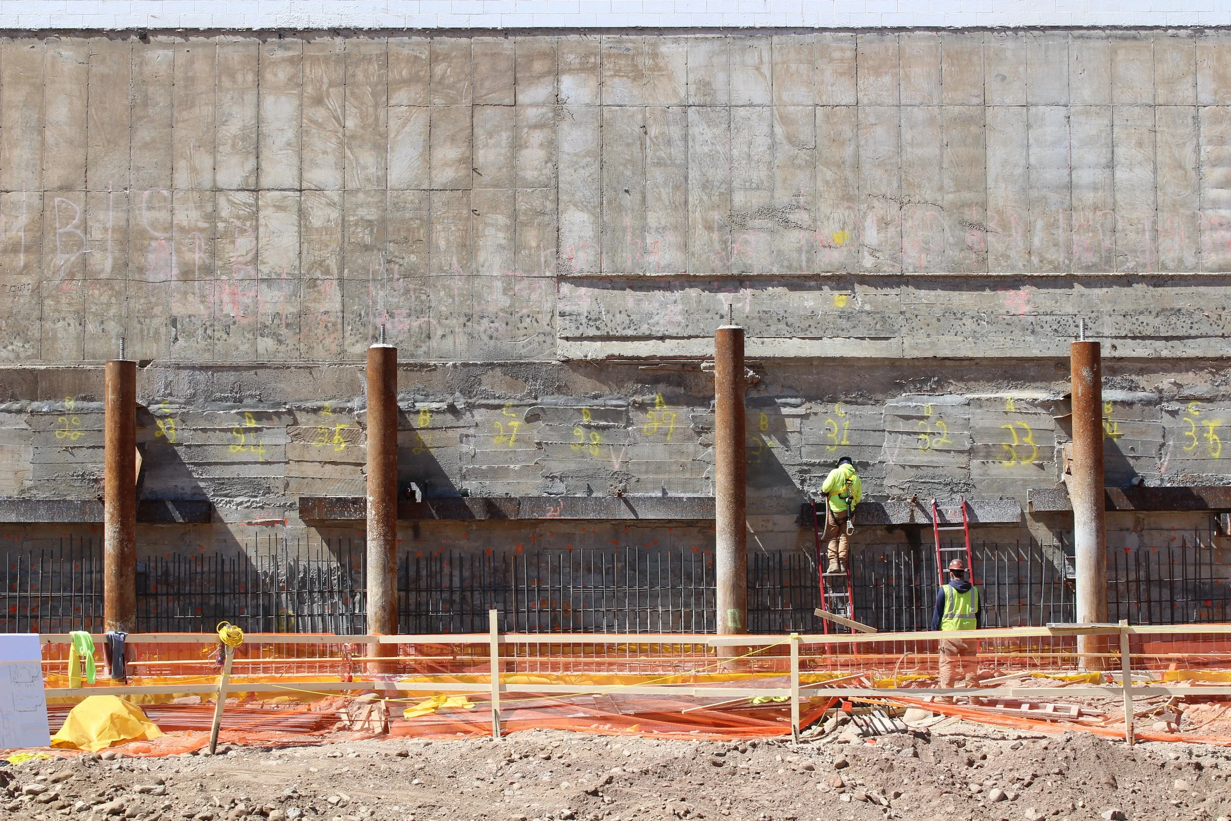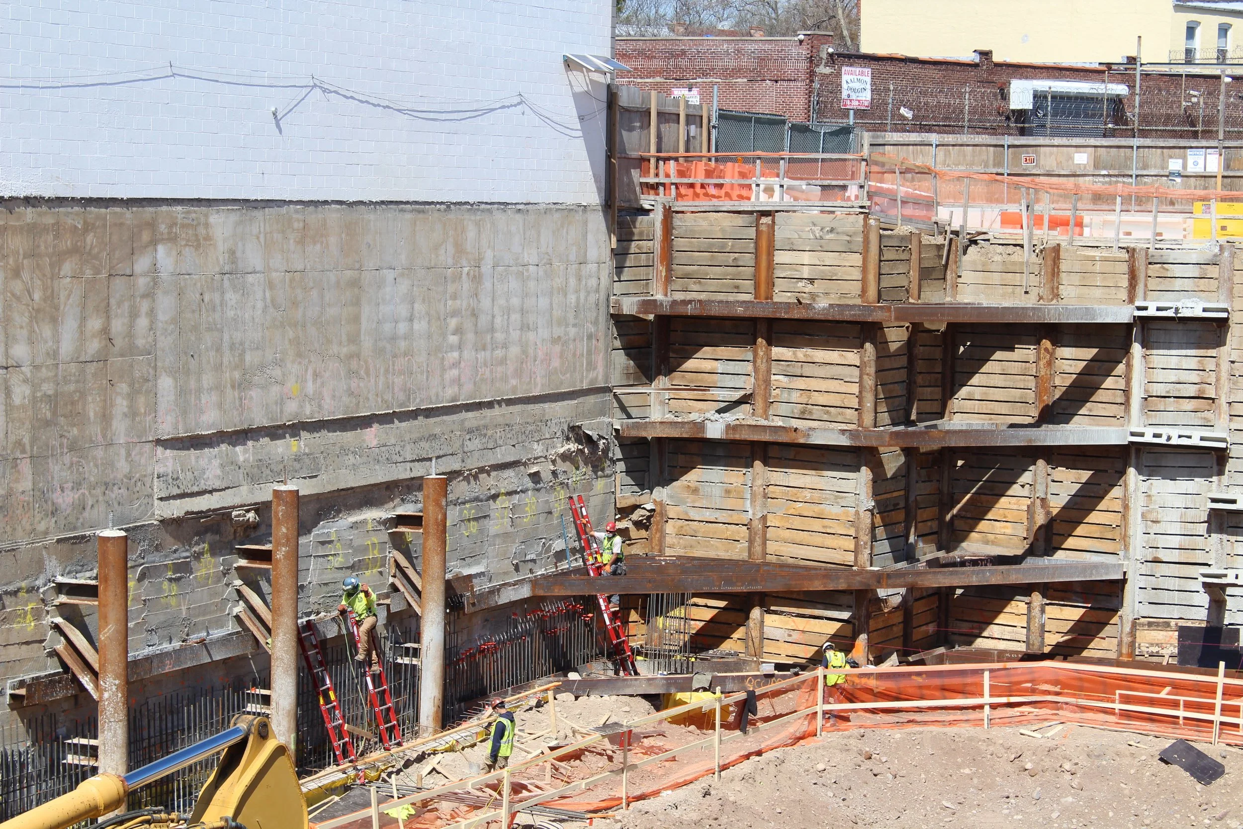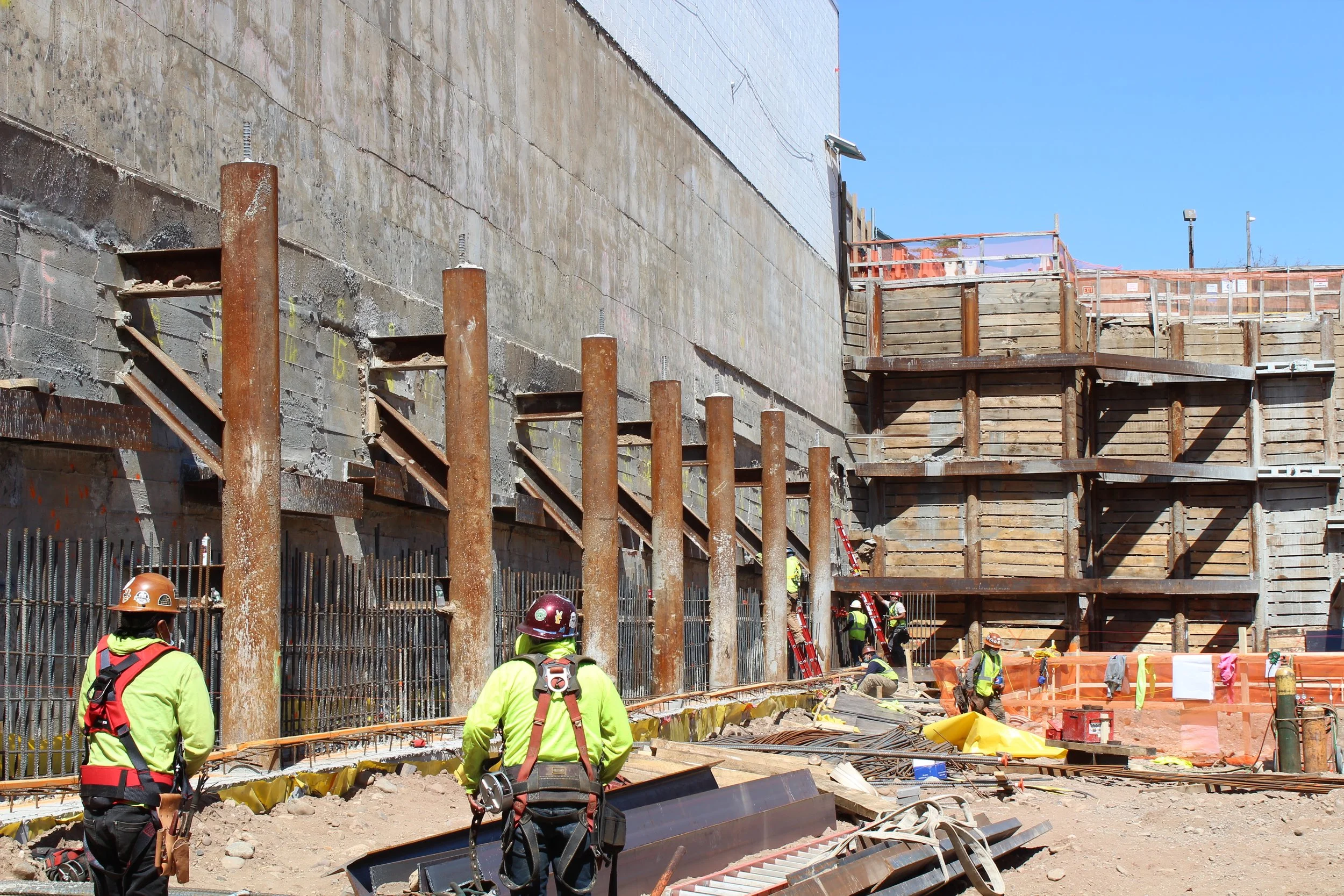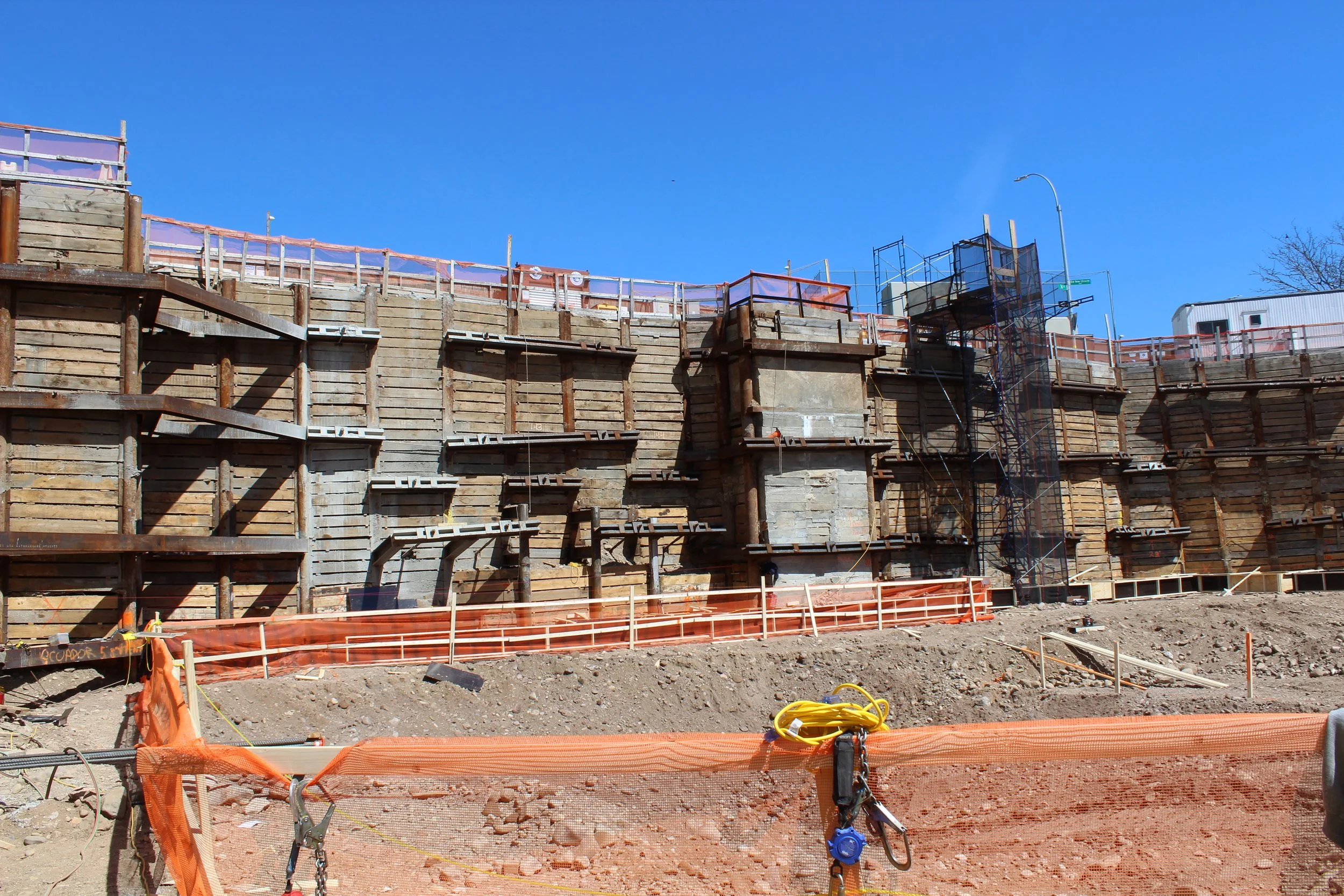 Amerigo also provided support of excavation design, engineering support and consultation services during the installations of the SOE and foundation. The proposed construction required an approximately 32’ excavation depth below the grade of the 0.6-ac lot. In regards to the adjacent structures, there is a 64’ tall building with a 12ft high cellar ceiling. The support of excavation consisted of solider piles accompanied by wood lagging along the street. The solider piles comprised of drilled piles and driven HP piles on supports of three tiers of tie-back systems. Conventional underpinning pins with tie-backs were constructed to support the adjacent buildings. Considering the height of the adjacent building and the required excavation depth for the underpinnings, the adjacent foundations were pre-supported using 16-inch diameter drilled piles prior to the commencement of the underpinning construction to limit the settlement of the building.